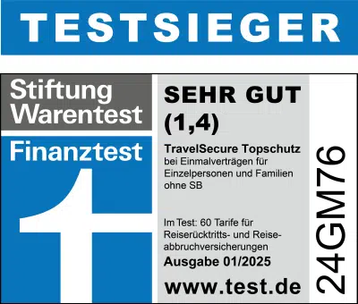 Die Zeitschrift Finanztest (Ausgabe 01/2025) der Stiftung Warentest hat 60 Tarifvarianten für Reiserücktrittsversicherungen bzw. Jahres-Reiserücktrittsversicherungen getestet und dabei wurde die Würzburger jeweils mit der Note SEHR GUT (1,4) als Testsieger bewertet.